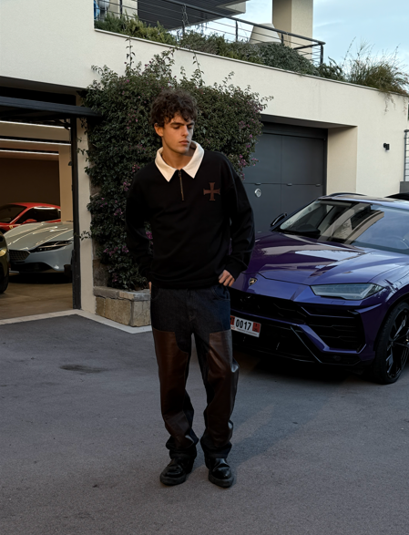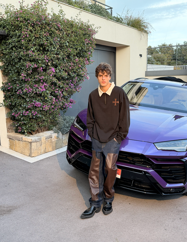 Light-wash denim reinforced with chocolate leather double-knee panels. Back pockets feature embossed leather cross patches. Straight-leg, workwear-inspired construction with durable stitching.